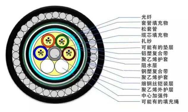 "室外用、油膏填充、鋁-聚乙烯內(nèi)護(hù)套鋼-聚乙烯內(nèi)護(hù)套、細(xì)圓鋼絲鎧裝、聚乙烯外護(hù)套"