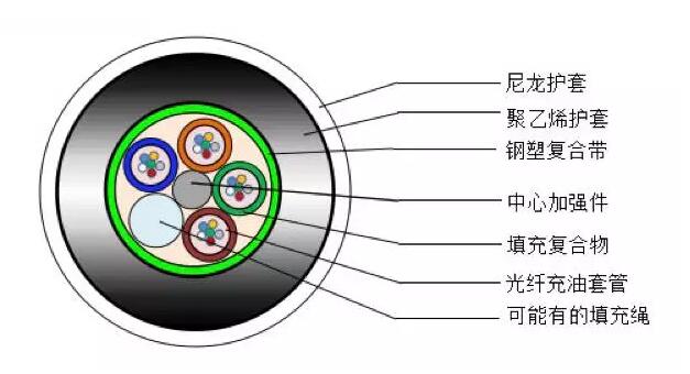 "室外用、中心管式、油膏填充夾帶鋼絲-聚乙烯護(hù)套、鋼-聚乙烯外護(hù)套"