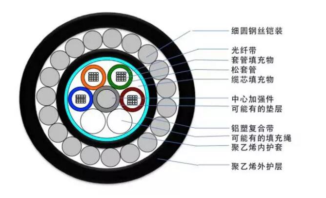 "室外用、油膏填充、光纖帶鋁帶-聚乙烯內(nèi)護(hù)套、細(xì)圓鋼絲鎧裝-聚乙烯外護(hù)套"