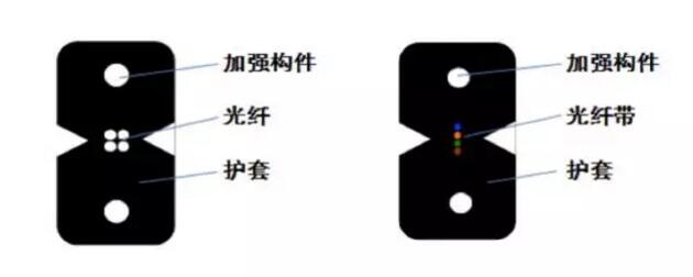 光纜結(jié)構(gòu)是將光纖(或光纖帶)放置在兩根平行加強(qiáng)件中間后擠包一層阻燃聚烯烴護(hù)套(LSZH),也可以是聚氯乙烯(PVC)護(hù)套;光纖芯數(shù)可以為1芯、2芯、4芯。