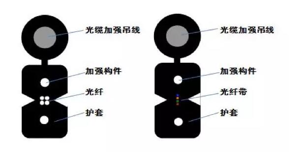 光纜結(jié)構(gòu)是將光纖(或光纖帶)放置在兩根平行加強(qiáng)件中間,同時(shí)在一端平行位置放置一根金屬吊線后擠包一層阻燃聚烯烴護(hù)套(LSZH);光纖芯數(shù)可以為1芯、2芯、4芯。