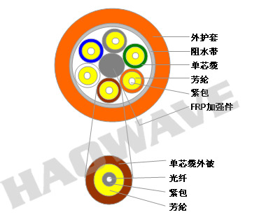 •單芯光纜(900um緊包、芳綸加強(qiáng)件)作為子單元,F(xiàn)RP中心加強(qiáng)