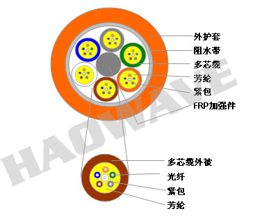 •多芯光纜(900um緊包、芳綸加強件)作為子單元,F(xiàn)RP中心加強件光纜子單元層絞FRP加強芯形成纜芯,最外擠制出一層聚氯乙烯(PVC)或低煙無鹵(LSZH)護套形成